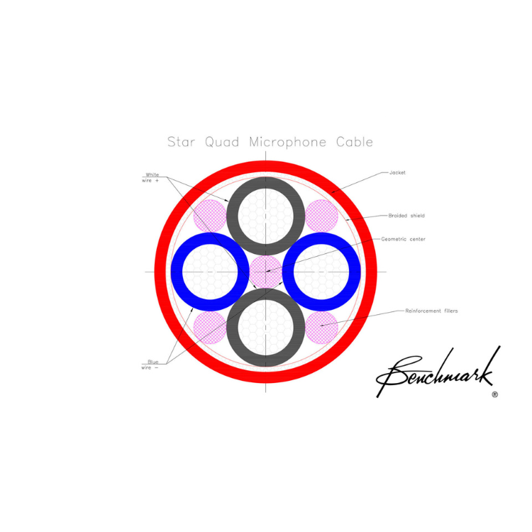 Benchmark Studio&Stage™ Analog XLR Cables are handcrafted in the USA with true silver solder. Benchmark-branded strain relief sleeves at each XLR connector provide a controlled cable bend radius to significantly extend the life of the cable at the most common point of failure - the entrance to the connector body.