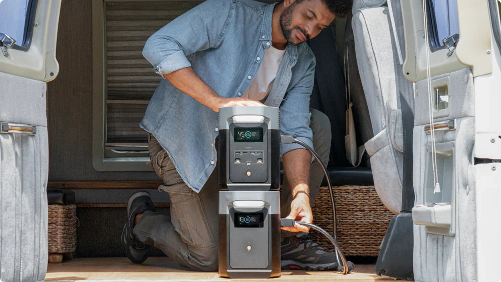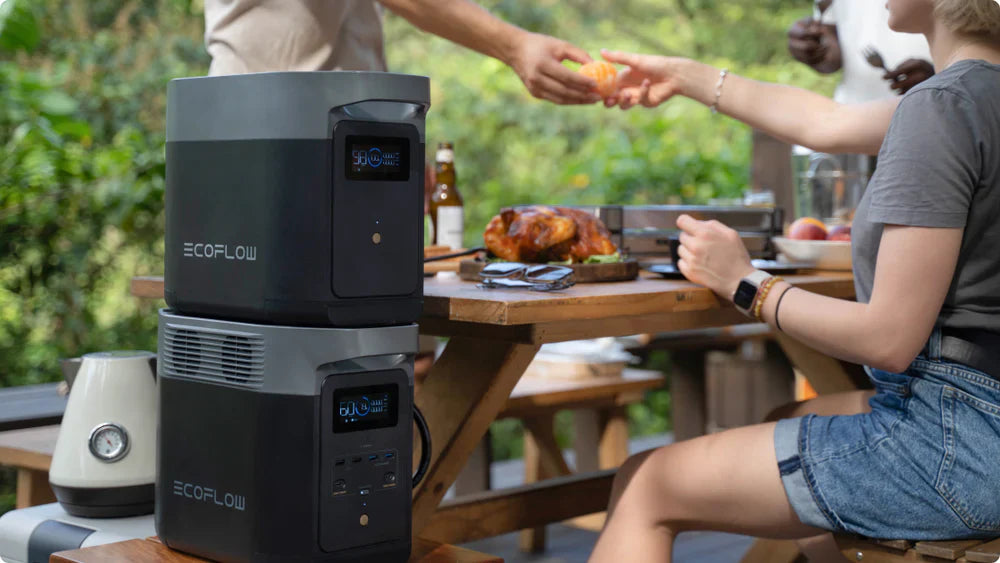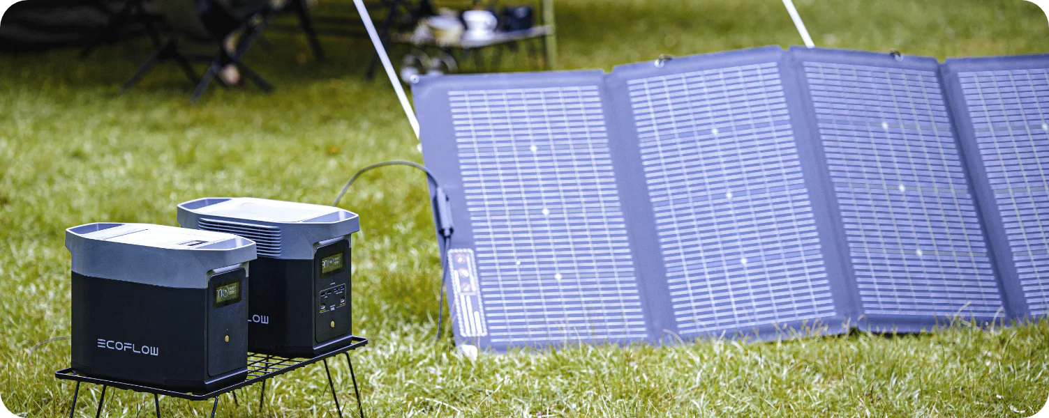 DELTA 2 and its Extra Battery charge and discharge in unison. Recharging from portable solar panels, AC outlets, or our Smart Generator is easy.