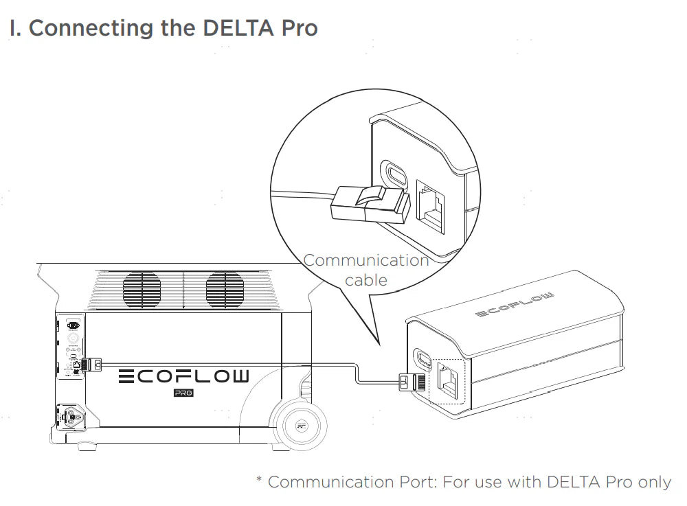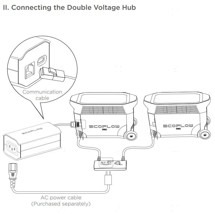Use the communication cable to connect with the communication ports (ethernet ports) of the grounding adapter and DELTA Pro.Use the AC power cable to connect the AC outlet of the grounding adapter and DELTA Pro.If using the double voltage hub to charge your electric vehicle, you need an extra NEMA 6-15P to C13 or NEMA 6-20P to C13 power cable to connect double voltage hub and the grounding adapter. Then use the communication cable to connect the communication ports (ethernet ports) of the grounding adapter and any DELTA Pro connected to double voltage hub.