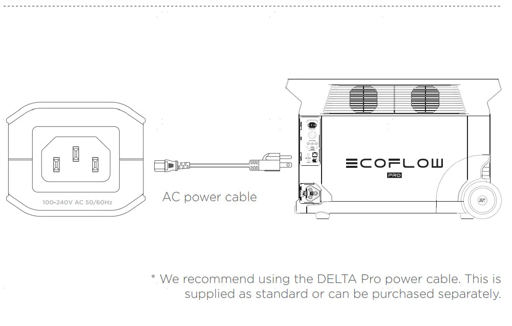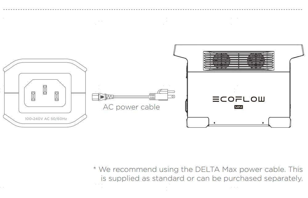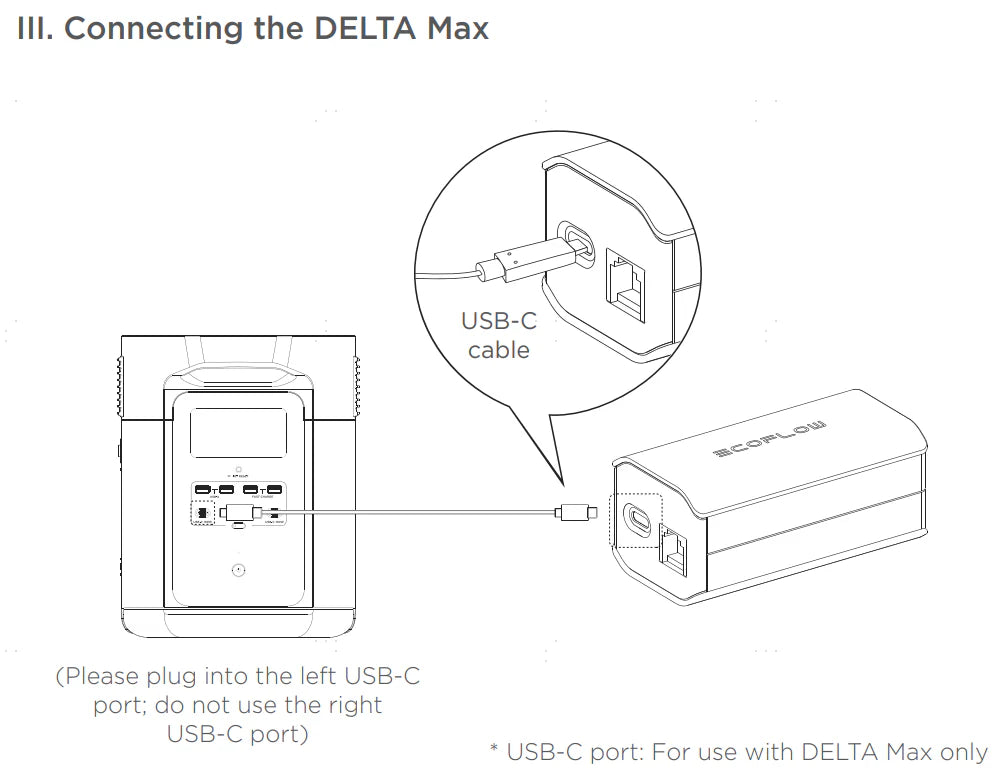 Use the USB-C cable to connect with the USB-C port of the grounding adapter and the left USB-C port on the DELTA Max.Use the AC power cable to connect the AC outlet of the grounding adapter and DELTA Max. Only use the USB-C Cable included with a portable power station grounding adapter. The Cable does not have any charging function, and other USB-C cables should not be used instead.